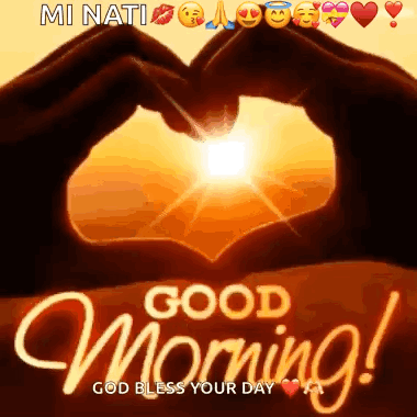 - Përshkrimi i përmbajtjes: a good morning greeting card with two hands making a heart shape with the sun in the background