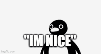 Përshkrimi i përmbajtjes: a black penguin says " im nice " in front of a dark background