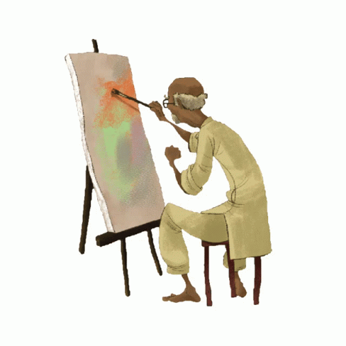 Përshkrimi i përmbajtjes: a cartoon of a man painting on an easel with a brush