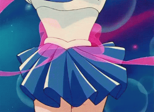 Përshkrimi i përmbajtjes: a cartoon of a girl in a blue skirt with a pink ribbon around her waist