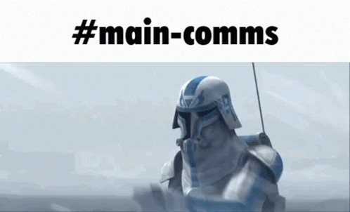 Opis sadržaja: a clone trooper from star wars is standing in front of a white background with the words `` # main-comms '' written on it