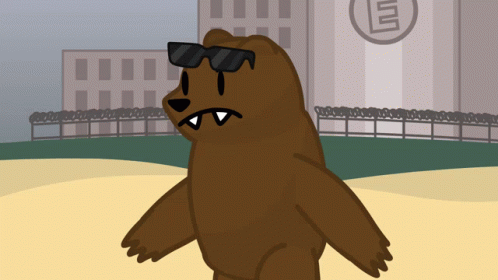 Opis sadržaja: a bear wearing sunglasses is standing in front of a building with the letter e on it