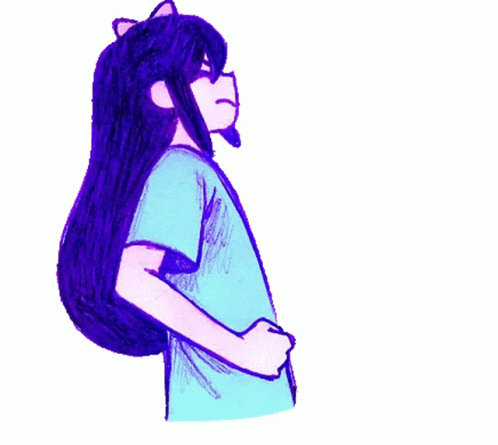 Opis sadržaja: a drawing of a girl with purple hair and a bow on her head