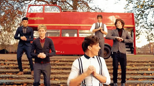 Opis sadržaja: a group of men standing on steps in front of a red double decker bus .
