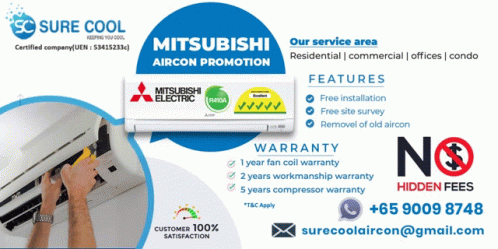 Opis sadržaja: a mitsubishi aircon promotion advertisement shows a man working on it