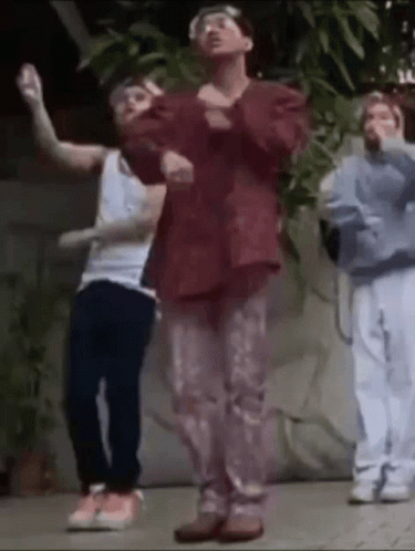 Opis sadržaja: a group of people are standing next to each other on a sidewalk and dancing .