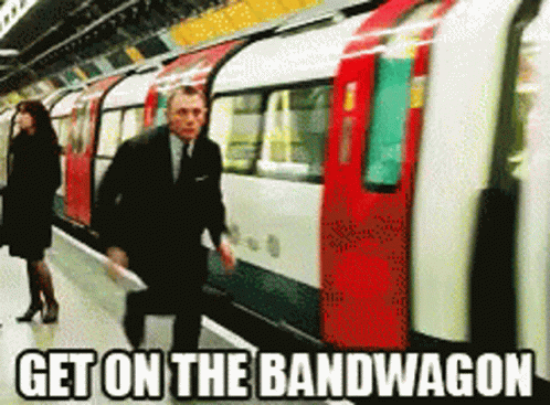 Opis sadržaja: a man in a suit and tie is walking towards a train with the words get on the bandwagon below him