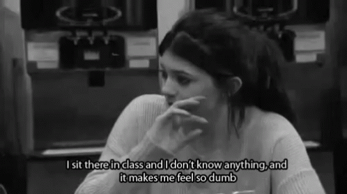 Opis sadržaja: a black and white photo of a woman sitting at a table with the caption i sit there in class