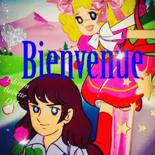Opis sadržaja: a cartoon of a girl with the word bienvenue in blue