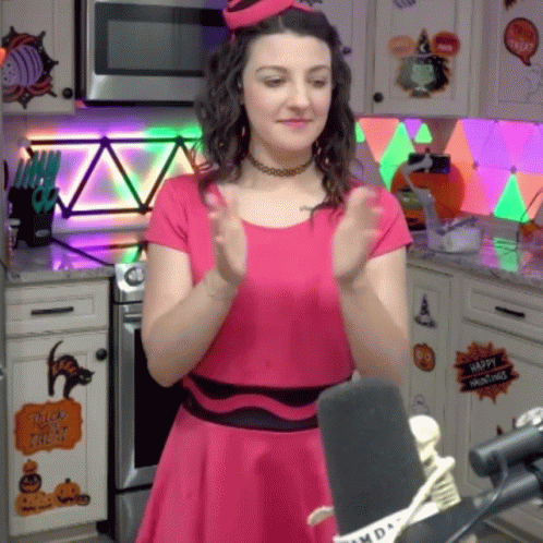 Opis sadržaja: a woman in a pink dress is clapping in front of a microphone in a kitchen