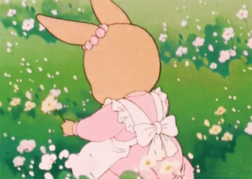 Opis sadržaja: a cartoon rabbit in a pink dress and apron is walking through a field of flowers