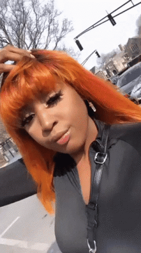 Opis sadržaja: a woman with orange hair is wearing a black jumpsuit and a black bag .