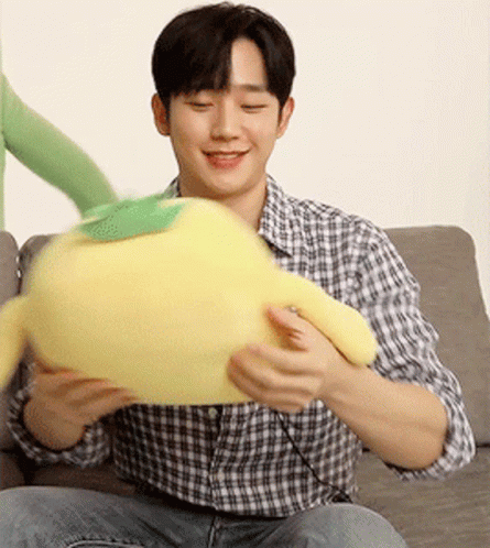 Opis sadržaja: a man in a plaid shirt is holding a stuffed animal in his hands .