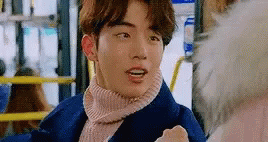 Opis sadržaja: a young man in a pink sweater is sitting on a bus talking to a woman .