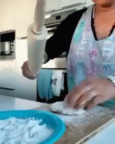 Opis sadržaja: a woman in an apron is rolling dough with a rolling pin .