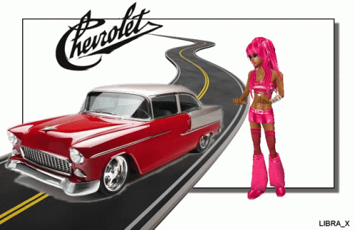 Opis sadržaja: a girl with pink hair is standing in front of a red chevrolet