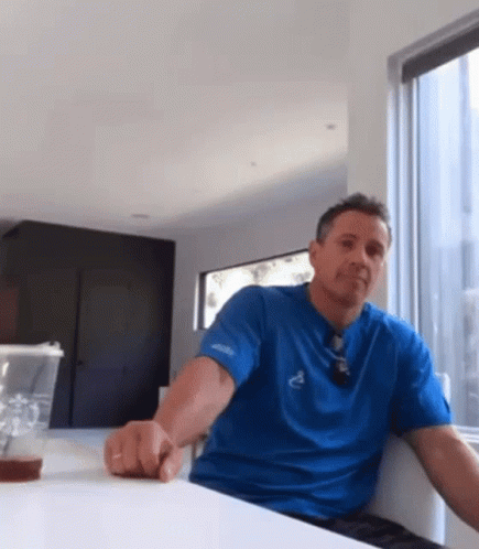 Opis sadržaja: a man in a blue shirt is sitting at a table with a cup of coffee in front of him .