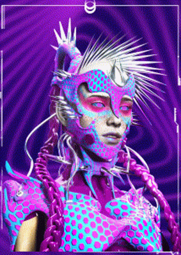 Opis sadržaja: a purple and blue painting of a woman with a mask on her face .