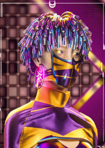 Opis sadržaja: a purple and yellow cartoon character with a mask on her face