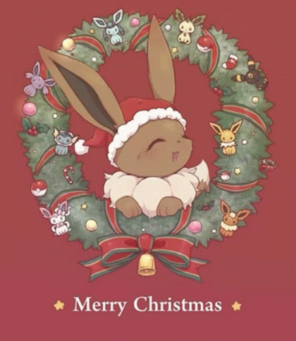 Opis sadržaja: an eevee wearing a santa hat is in a christmas wreath with other eevees
