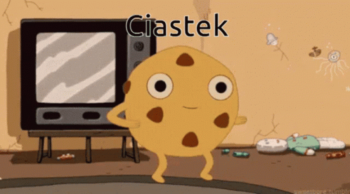 Opis sadržaja: a cartoon of a cookie dancing in front of a tv with the word ciastek on it