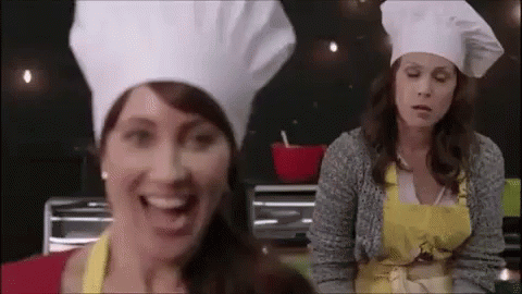 Opis sadržaja: two women wearing chef hats and aprons are smiling in a kitchen