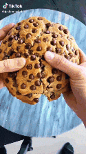 Opis sadržaja: a person is holding a chocolate chip cookie in their hands .