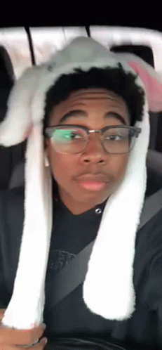 Opis sadržaja: a young man wearing glasses and a bunny ear hat is sitting in a car .