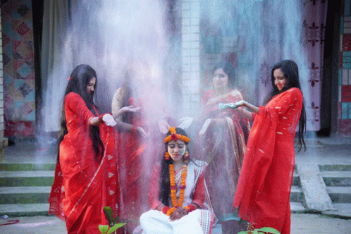 Opis sadržaja: a woman in a white dress is being sprayed with red powder