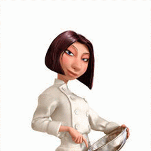Opis sadržaja: a cartoon woman in a chef 's coat is holding a metal bowl .