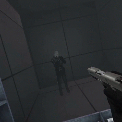 Opis sadržaja: a person holding a gun in a dark room with a man in a helmet behind them