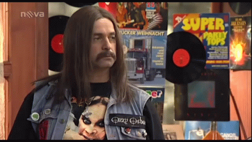 Opis sadržaja: a man with long hair and a mustache wearing a vest that says ozzy osbourne on the back