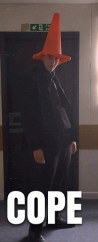 Opis sadržaja: a man wearing a cone hat is standing in front of a door with the word cope below him