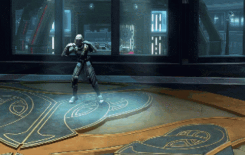 Opis sadržaja: a man in a futuristic suit is standing in a room with a circular pattern on the floor