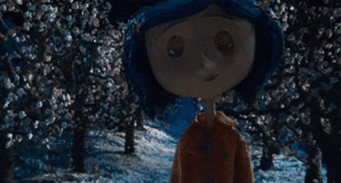 Opis sadržaja: a cartoon character with blue hair is standing in a snowy forest at night .