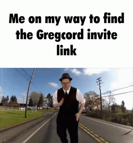 - Opis sadržaja: a man in a hat and vest is running down a street with the words " me on my way to find the gregcord invite link " below him