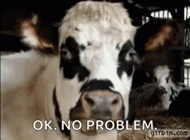 - Opis sadržaja: a cow with black spots on its face is looking at the camera with the words `` ok , no problem '' written next to it .