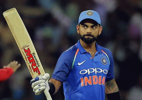 Opis sadržaja: a man in a blue shirt that says india holds up his bat