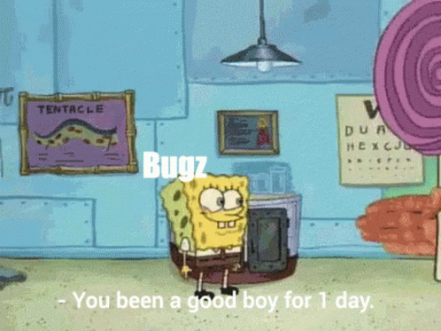 Opis sadržaja: a cartoon of spongebob saying " bugz " in a room