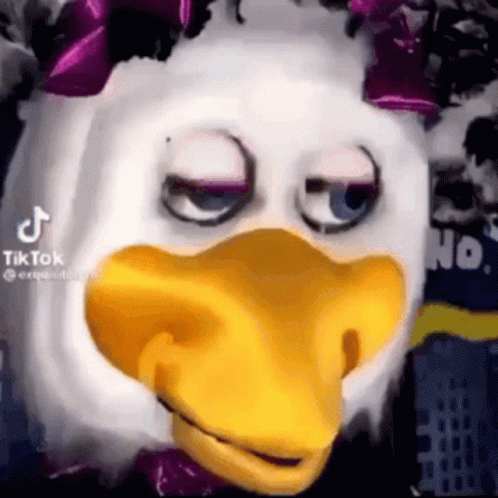 Opis sadržaja: a close up of a duck mask with purple bows on its head