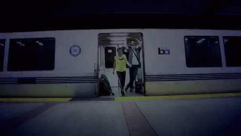 Opis sadržaja: a couple walking out of a train that says boi on it