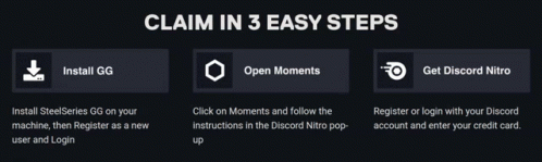 Opis sadržaja: a claim in 3 easy steps page shows how to register or login with your discord account and enter your credit card