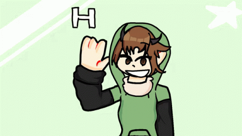 Opis sadržaja: a cartoon character says hello with a green hoodie on