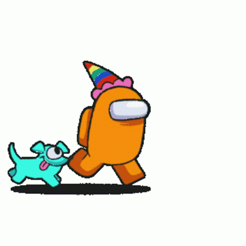 Opis sadržaja: an orange among us character wearing a party hat is walking next to a blue dog wearing a party hat .