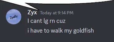 Opis sadržaja: zyx today at 9:14 pm i cant lg rn cuz i have to walk my goldfish ..