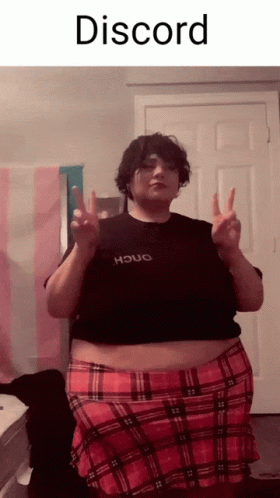 Opis sadržaja: a person wearing a plaid skirt and a black shirt that says houo giving a peace sign