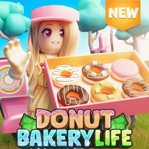 Opis sadržaja: a girl is holding a box of donuts in front of a sign that says donut bakery life