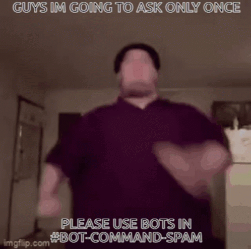 Opis sadržaja: a man in a purple shirt is asking people to use bots in # bot-command-spam .