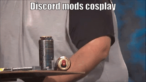 Opis sadržaja: a person is holding a tray with a can of beer on it and the words discord mods cosplay written on the bottom