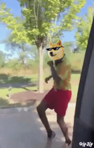 Opis sadržaja: a doge wearing sunglasses is dancing with a person